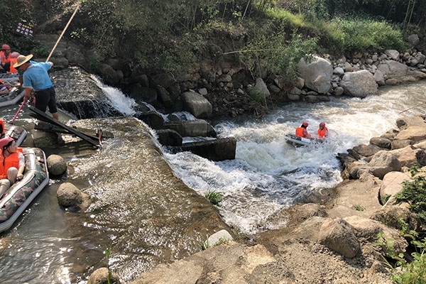 之后迎來重頭戲——漂流。在安全員的介紹培訓后,男女一組坐上了氣墊筏,在等待開閘漂流的時間,拋棄了身份,性別,打起了水仗,不得不說這是加深同事感情的不二法門。300米的落差,跟隨水流,一路向下,打著水仗,嬉嬉鬧鬧,即便全身濕透,仍然玩的不亦樂乎。