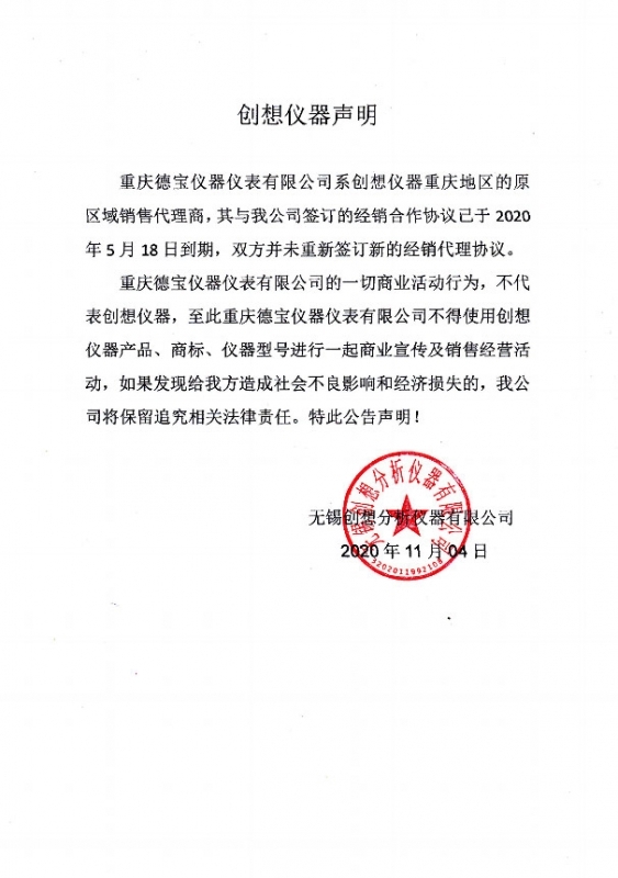 GLMY創想儀器公司公告,聲明和重慶德寶儀器儀表有限公司協議到期。