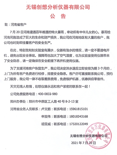心系洪災,創想儀器告河南省客戶通知書