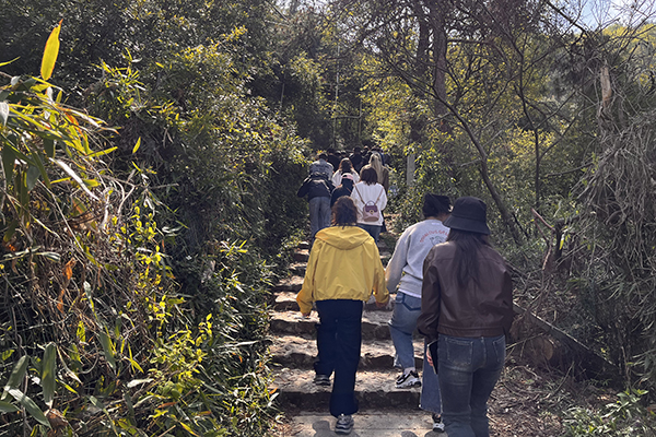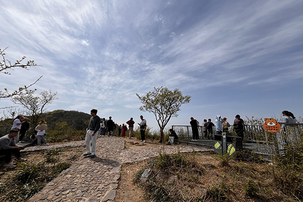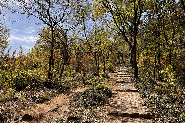 春風裹挾著草木的清氣,在耳畔絮語。天朗氣清,同事們身著輕便裝束,三三兩兩結伴而行,起初石階尚算平緩,還能輕松談笑。行至半路,領頭的幾個年輕人早已不見蹤影,中間的一撥走走停停,不時掏出手機拍照,或是扶著膝蓋喘幾口粗氣。落在后頭的幾位,索性尋了塊平整的石頭坐下,掏出水壺慢飲,倒像是在自家庭院納涼。