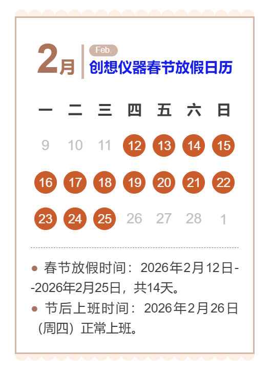 ● 春節放假時間:2026年2月12日--2026年2月25日,共14天。