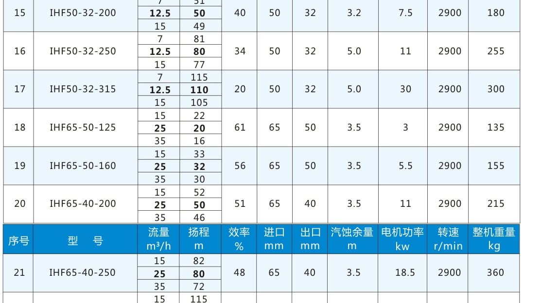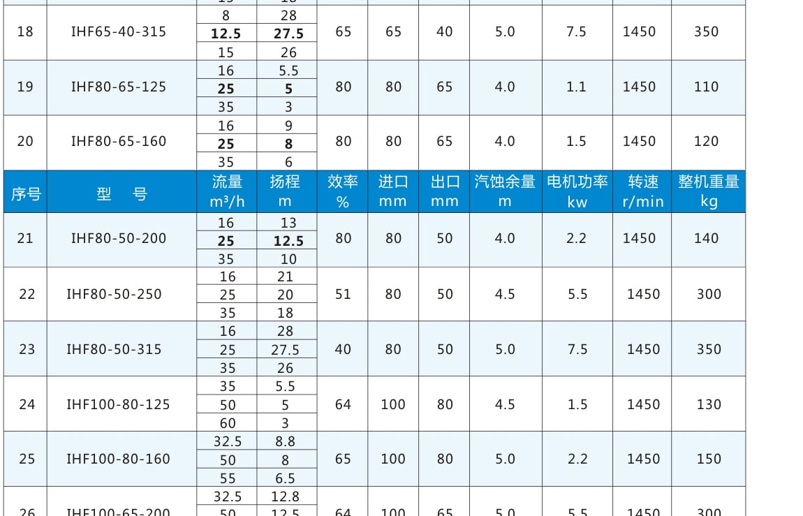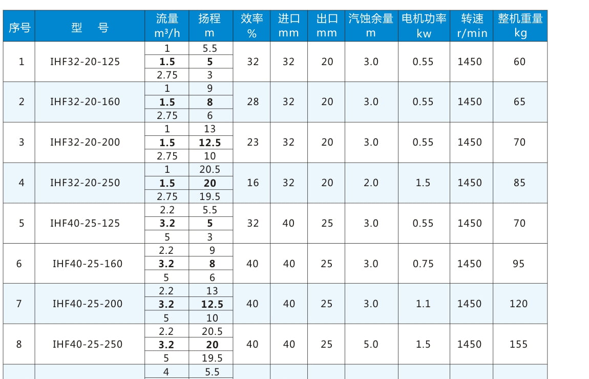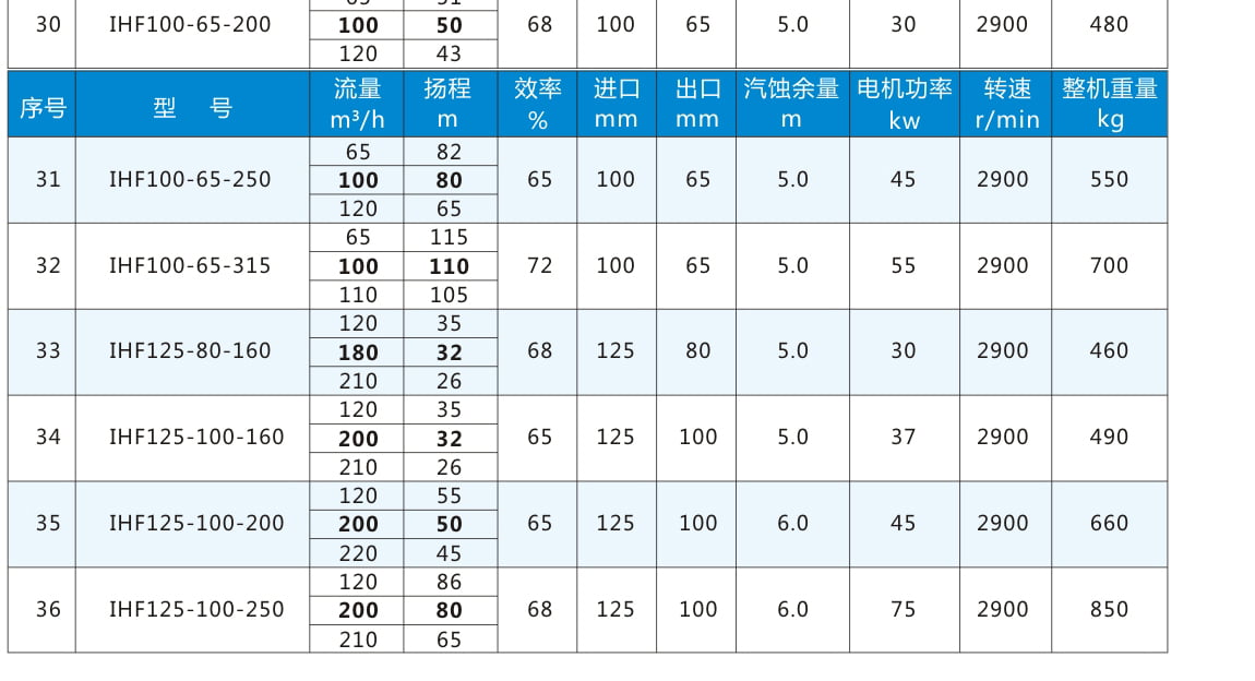IHF:氟塑料合金離心泵代號丨 80:進口直徑80mm 65:出口直徑65mm 160:葉輪名義直徑160mm