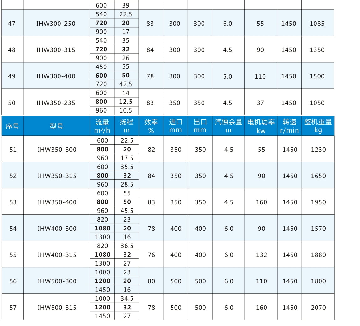 性能參數表三:電機轉速980r/min,表中流量揚程加粗為額定參數